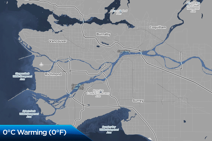 На активной карте выше видно, как выглядит эта область на западе Канады сейчас и что может произойти вследствие глобального потепления. Увы, даже самые оптимистичные прогнозы согласны с тем, что Ричмонд, Делта и части Абботсфорда и Коквитлама уйдут под воду к 2100 году.