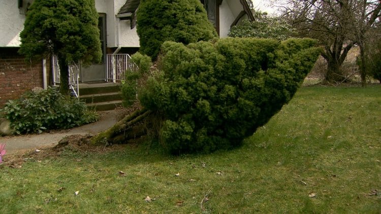 Признаки неприятностей видны уже снаружи, где валяются шины, мусор, стоит сломанная лестница, а «гвоздь программы» — вывернутое с корнем дерево.
