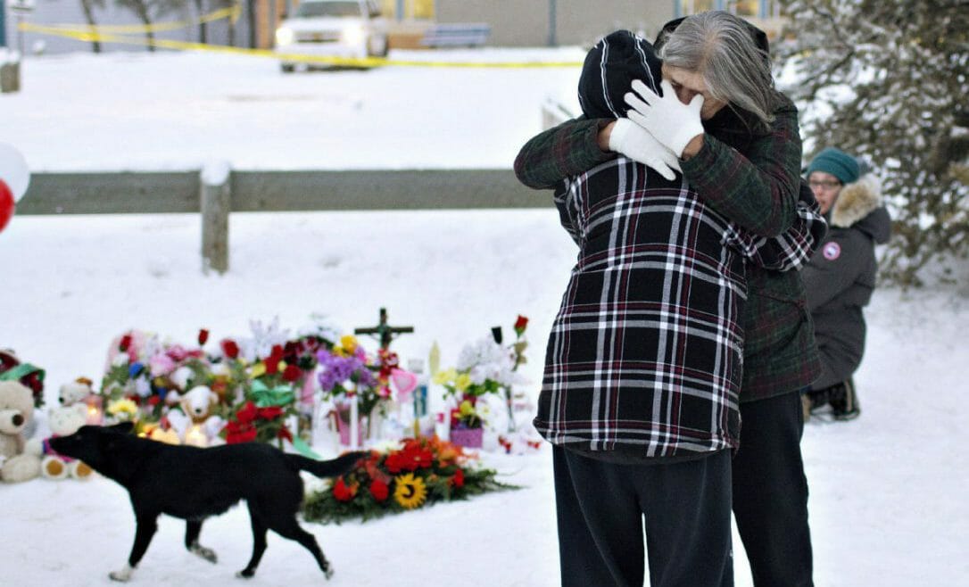 Члены RCMP стоят около школы La Loche Community School (провинция Саскачеван), 25 января 2016. Двумя днями ранее учащийся школы пришел в учебное заведение и открыл огонь по тем, кто находился внутри. Погибло 4 человека.