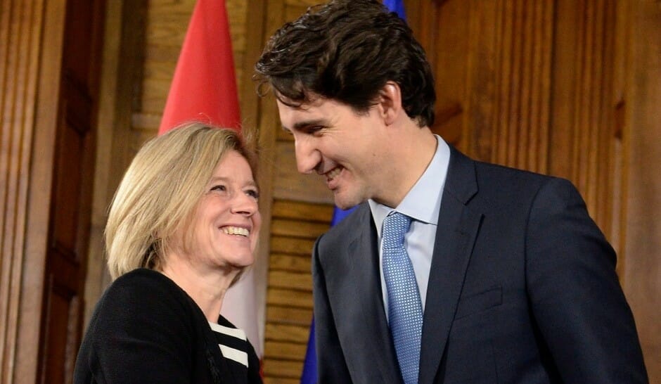 Трюдо и премьер Альберты Рэйчел Нотли пожать руки после того, как федеральное правительство одобрило спорный план компании Kinder Morgan о расширении нефтепровода Trans Mountain.