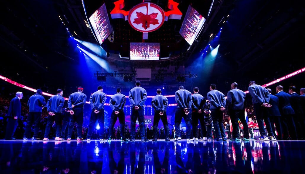 Игроки NBA слушают национальные гимны в первой половине матча «Всех звезд NBA» в Торонто в воскресенье, 14 февраля, 2016.
