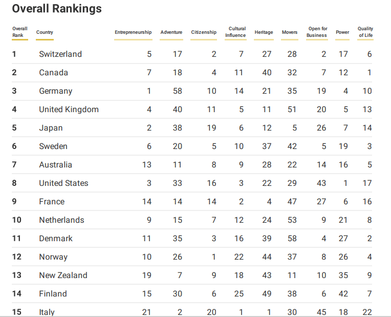 Канада заняла престижное второе место, уступив только Швейцарии. На третьем месте расположилась Германия, далее следуют Великобритания, Япония, Швеция, Австралия, США, Франция и замыкает ТОП-10 Нидерланды.
