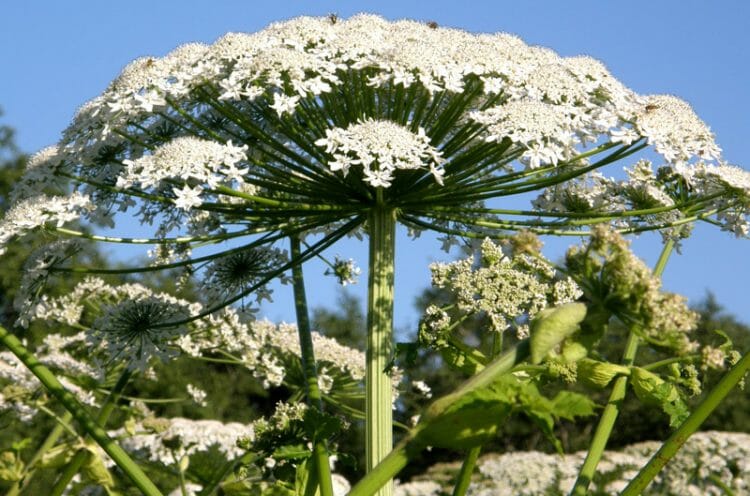 Гигантский борщевик — это инвазивное многолетнее растение с белыми цветами, которое может вырасти до 3,5 м в высоту.
