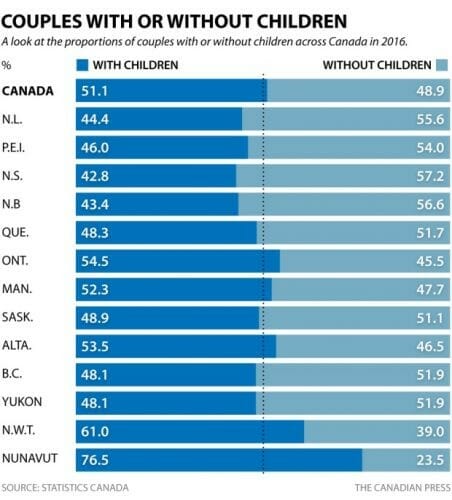 Пары с по крайней мере одним ребенком составляли 51,1% всех пар. Наибольший спад произошел в Атлантической Канаде, причем самая низкая доля в Новой Шотландии — 42,8%.