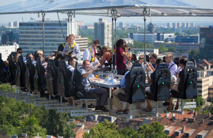 Побалуйте себя уникальным часовым ужином! В чем его уникальность? Гости ресторана поднимаются в воздух на высоту 50 метров и испытывают массу впечатлений от вида и, конечно же, блюд. Платформа вмещает 22 человека, которых сопровождают повара и официанты. Ужин за столом, висящим в воздухе, обязательно запомнится на всю жизнь.