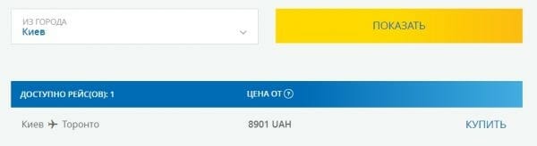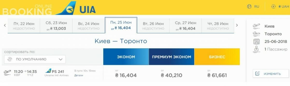 При этом если смотреть по факту, то цены на порядок выше. Мы решили посмотреть сколько будет стоить билет в одну сторону из Киева в Торонто, например, на 25 июня. И цена за билет эконом класса на человека вышла $630 и, увы, это не самый дорогой вариант на ближайшие месяцы.