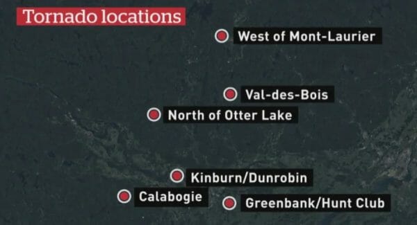 Environment Canada ранее подтвердила торнадо EF-3, которое прошлось через сельские районы Оттавы Кинберн и Данробин, а затем отправилось в Гатино; торнадо EF-2 между Арлингтон Вудс и окрестностями Гринборо и торнадо EF-1 в Калабоги.