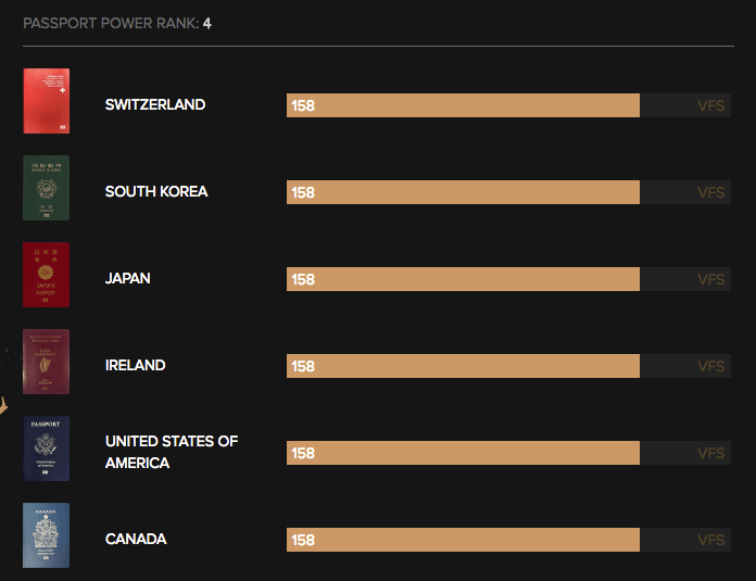 Канада теперь делит четвертое место с паспортами Сингапура, Швеции, Франции, Бельгии, Мальты, Греции и Норвегии с VFS (безвизовый балл) 166, что является самым высоким безвизовым показателем Канады на сегодняшний день.
