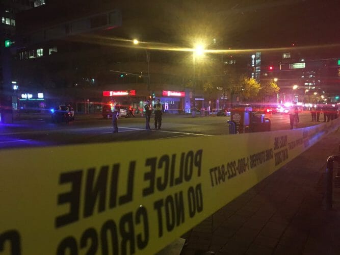Первая атака произошла в субботу около 8 часов вечера, когда офицер управлял движением при перекрытии улиц во время игры местной футбольной команды Edmonton Eskimos на стадионе Commonwealth Stadium.