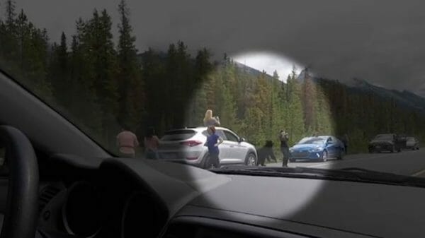 На кадрах видно, что машины выстроились вдоль обочины трассы рядом с Национальным парком Джаспер, а люди со смартфонами и фотоаппаратами снимали черного медведя.