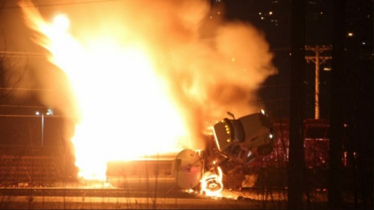 В провинции Британская Колумбия произошла масштабная авария: железнодорожный состав столкнулся с автоцистерной с этиловым спиртом.